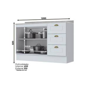 Dimensões(Cm): Comnto(Profundidade): 120cm x Largura: 51cm x Altura: 82cm Material de Estrutura - 100% MDF Tipo de Móvel - Apropriado p/ Uso de Pia - Gabinete s/ Tempo Tipo de Pintura - Pintura em UV (Ultravioleta) Tipo de Acabamento da Pintura - Fosca Tipo de Acabamento - Interior em Trama Tipo de Dobradiças - Dobradiças c/ Amortecimento Tipo de puxador - Metal Zamac Quantidade de Portas - 2 Portas de Abrir Quantidade de Gavetas - 3 Gavetas Tipo de Corrediça - Telescópicas Diferenciais das Gavetas - c/ Porta Talher Montagem do Produto - Desmontável Certificação de Qualidade - Certificação de Qualidade Aprovada Garantia - 3 meses
