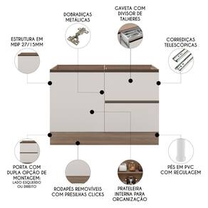 Conta com uma porta com dobradiças metálicas reforçadas, que proporcionam um movimento suave, além de duas gavetas externas e uma interna com divisor de talheres. As corrediças telescópicas permitem uma abertura total, facilitando o acesso aos itens armazenados.