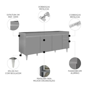 Características do Produto Material da Estrutura: MDP 15 mm. Acompanha tampo: Não. Acabamento: Pintura BP. Peso Suportado: 42 Kg distribuídos. Escala de Brilho: Fosco. Possui Prateleiras: Sim. Material da Prateleira: MDP. Quantidade de Prateleiras: 1 Prateleira. Possui Portas: Sim. Material da Porta: MDP. Quantidade de Portas: 4 Portas. Tipo de Porta: Convencional. Tipo de dobradiças: Metálicas. Possui Gavetas: Sim. Material da Gaveta: MDP. Quantidade de Gavetas: 2 Gavetas. Tipo de corrediças: Metálicas. Possui Nichos: Não. Possui Puxador:Sim, alumínio. Possui Pés: Sim, PVC. Diferenciais: - Design moderno. - Pés reguláveis. - NÃO ACOMPANHA TAMPO/PIA. Sistema de Montagem: Cavilhas/Parafusos. Manual de Montagem: Sim. Complexidade da Montagem: Média. Volumes: 1 Volume. Conteúdo da Embalagem: 1 Balcão. Garantia do Fabricante: 90 dias contra defeito de fabricação. Montagem: Recomendamos que seja feita por um profissional. Recomendação de Limpeza: Utilize pano úmido.