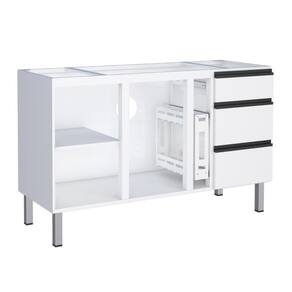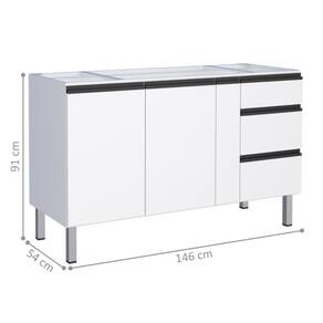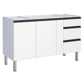 Estrutura em Aço em eletrogalvanizado. Possui 2 portas, 3 gavetas com corrediças telescópicas e divisor de talheres, 1 prateleira e porta condimento.