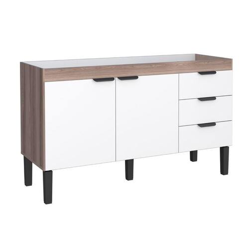 Estrutura em Aço em eletrogalvanizado. Possui 2 portas, 3 gavetas com corrediças telescópicas e divisor de talheres, 1 prateleira