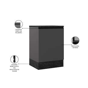 Puxador Perfil O puxador perfil em polímero preto com acabamento em alta cobertura reforça o visual moderno do móvel. Os pés em PVC de 14,5cm reguláveis permitem nivelamento perfeito ao piso. Conta ainda com rodapés removíveis com presilhas modelo click, facilitando a limpeza.