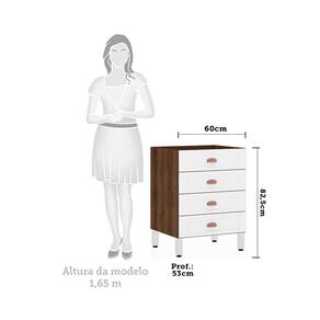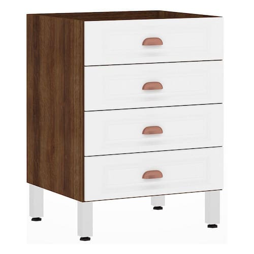 Características: Produzido em MDP 15mm Corpo/Caixaria: Nogueira Dourado FF Frontais: MDF Branco Pet Corrediças: Telescópicas Puxadores: Plástico Cobre Gavetas: 4
