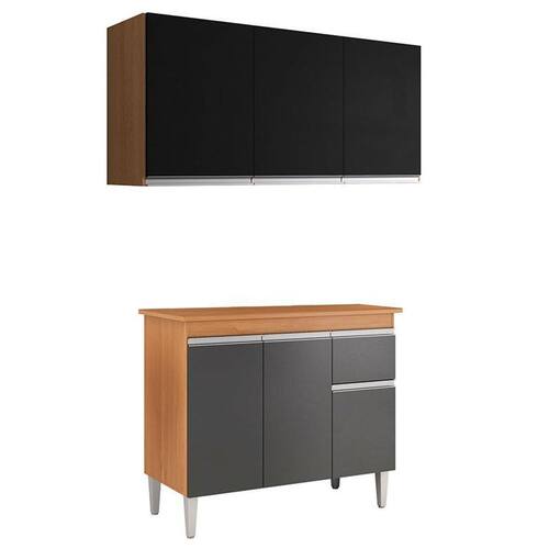 Balcão de Cozinha Tatiane com Tampo 100cm e Armário Aéreo Andréia 3 Portas Amêndoa Preto - AJL