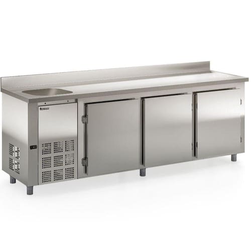 Balcão de Encosto 3 Portas e 1 Pia 765 Litros GBFE250CEAI Gelopar. Conservador e Expositor de frios, laticínios, bebidas e alimentos diversos não congelados. Ideal para cozinhas industriais de hotéis, restaurantes, clubes, bares, lanchonetes, confeitarias, mercados, mercearias e outros. Temperatura: 0 a +7C. Refrigeração: Ar forçado com evaporador aletado. Controlador eletrônico com indicador de temperatura. Degelo automático (frost free). Portas: Cegas. Prateleiras: 1 nível aramadas e regulável. Resistência no quadro de portas. Revestimento interno em aço galvanizado. Revestimento externo do tampo em aço inox 304 escovado, gabinete em aço inox 430 e traseira e fundo em aço galvanizado. Tampo com cuba de 40x34x13cm. Tampo liso, sem rebaixo. Pés niveladores. Motor do lado esquerdo, para quem está de frente para as portas. Compatível com cuba GN e caixa euronorm. ATENÇÃO: não acompanha cubas, torneira e sifão. CAPACIDADE: 765L. TEMPERATURA: 0 a +7C. CONSUMO: 6,7 kWh/dia. PESO: 114kg. DIMENSÕES EXTERNAS (PxAxF): 70x100/90x250cm. Equipamento certificado conforme Portaria Inmetro nº 371/2009. Balcão de Encosto 3 Portas e 1 Pia 765 Litros GBFE250CEAI Gelopar é na Atau.