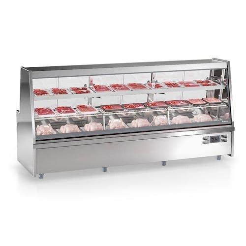 Balcão De Frios E Avícola Grta300 Gelopar Expositor De Carnes Inox 3mt 220v Balcão Frigorifico Avícola Linha Turino 3MT GRTA300 Gelopar. Conservação e exposição de carnes e aves (não congeladas). Refrigeração: Estática com 1 placa fria (prateleira) e serpentina de cobre. Temperatura: 0 a +7C. Degelo: Manual. Controlador eletrônico com indicador de temperatura. Revestimento Interno: Revestimento interno em aço inox 430. Revestimento Externo: Laterais em aço injetado, parte externa pré pintada, parte interna aço inox. Iluminação LED (interna), com interruptor. 2 níveis (1 nível placa fria e 1 aramado). Grades nas placas frias. Pés niveladores. Capacidade da placa fria / prateleira: 15kg/metro por prateleira. Vidros sujeitos a condensação da umidade do ar. Vidro frontal temperado, baixo emissivo. CAPACIDADE: 1546 L. PESO: 219kg. TEMPERATURA: 0 a +7C. CONSUMO: 9,5 kWh/dia. DIMENSÕES EXTERNAS (CxAxL): 300x146,2x96,5cm. Equipamento certificado conforme Portaria Inmetro n 371/2009. Balcão Frigorifico Avícola Linha Turino 3MT GRTA300 Gelopar é na Atau. Tamanho - 3,00 M Marca - Gelopar Modelo - GRTA300 Capacidade - 1546 L Frente - 300cm Altura - 146,2cm Temperatura - +1 a +7C Peso - 219kg Profundidade - 96,5cm Consumo - 9,50 kWh/dia