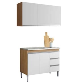 Balcão de Pia 100cm e Armário Aéreo Andréia 3 Portas Amêndoa Branco - AJL