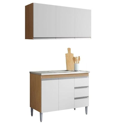 Está montando sua cozinha? Então apresentamos para você este belo conjunto composto pelo balcão e armário da linha Andréia. O balcão conta com duas portas, três gavetas equipadas com corrediças metálicas que garantem maior durabilidade e suavidade, puxadores embutidos entregam um visual moderno, além dos pés em PVC. Complementando o conjunto, o armário possui três portas. Assim como o balcão, possui puxadores em PVC e uma prateleira. Fabricados pela AJL, são desenvolvidos em 100% MDP, sendo a escolha ideal para quem busca aproveitar o espaço e manter organizado durante o dia a dia. Aproveite e garanta já o seu!