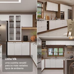 Além de trazer elegância, a linha Vik é funcional em cada detalhe. As portas possuem dobradiças com amortecimento, garantindo um fechamento suave e silencioso, enquanto as gavetas permitem abertura total, para você organizar tudo que precisa com muito mais facilidade.