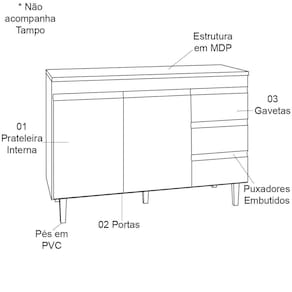 Características do Balcão de Pia 120 cm Sem Tampo 2 Portas e 3 Gavetas Adriana: