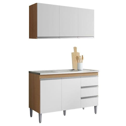 Começou a procurar móveis para sua cozinha? Apresentamos para você este belo conjunto composto pelo balcão e armário da linha Andréia. O balcão conta com duas portas e três gavetas com corrediças metálicas. Os puxadores embutidos dão um visual moderno, enquanto os pés em PVC oferecem mais estabilidade e resistência à umidade. Complementando o conjunto, o armário possui três portas e assim como o balcão, tem 120cm de largura, uma prateleira ideal para organizar seus utensílios ou mantimentos e puxadores em PVC. Fabricados pela AJL, são desenvolvidos em 100% MDP, sendo a escolha perfeita para quem busca deixar a cozinha mais bonita, organizada e funcional. Aproveite e garanta já o seu!