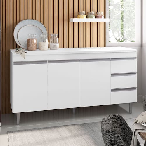 Características: Estrutura MDP Pintura UV 03 Portas com Dobradiças metálicas 03 Gavetas com Corrediças Metálicas 01 Prateleira com amplo espaço Pés de Plástico ACOMPANHA TAMPO.