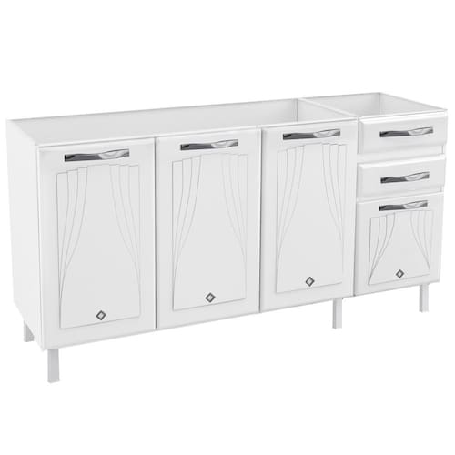 O Balcao de Pia em Aco 4 Portas 2 Gavetas 160cm sem Pia Star New Telasul e ideal para organizar sua cozinha com funcionalidade e estilo. Possui 4 portas com apliques resinados e 2 gavetas com corredicas metalicas que suportam ate 3kg cada. Sua estrutura em aco com revestimento BF e pintura eletrostatica anticorrosiva garante resistencia e durabilidade. Conta com prateleira interna que suporta ate 15kg, base reforcada para ate 30kg, pes regulaveis e puxadores em plastico. Nao acompanha tampo.