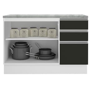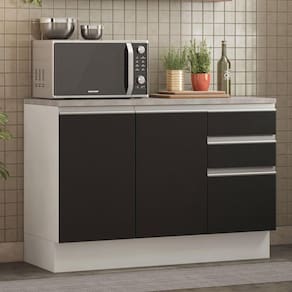 É desenvolvido com materiais de alta qualidade, como puxadores em alumínio e dobradiças metálicas com amortecimento. Conta com duas portas e três gavetas com corrediças telescópicas, sendo uma delas maior. É ideal para panelas, utensílios, louças, talheres, eletroportáteis e o que mais você necessitar.
