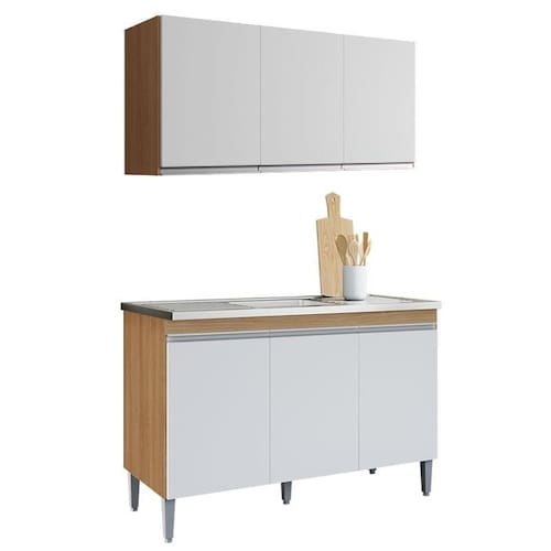 Começou a montar sua cozinha? Então apresentamos para você este belo conjunto composto pelo balcão da linha Manu e o armário da linha Andréia. O balcão conta com puxadores embutidos proporcionando um visual limpo e elegante. Seus pés em PVC oferecem mais estabilidade e ajuda na hora da limpeza, protegendo da umidade. Tanto o balcão quanto o armário, possuem puxadores em PVC, três portas e uma prateleira interna, permitindo uma organização mais prática. Fabricados pela AJL, são desenvolvidos em 100% MDP, sendo uma escolha ideal para quem busca funcionalidade, estilo e um excelente custo benefício. Aproveite e garanta já o seu!