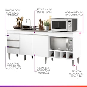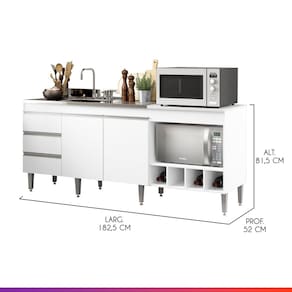 Praticidade e elegância para sua cozinha em um único móvel. Este balcão de 183 cm em MDP branco com acabamento UV foi projetado para otimizar espaços e facilitar sua rotina. Possui espaço preparado para pia, cooktop de 4 bocas, nichos para forno/micro-ondas e adega para até 4 garrafas, além de duas portas com prateleira interna e três gavetas espaçosas. Durável e resistente, é a escolha certa para ambientes que exigem beleza e funcionalidade. CARACTERÍSTICAS TÉCNICAS: - Produzido em MDP de 15 mm - Acabamento UV na cor branco - Gavetas com corrediça metálica - Portas com dobradiça metálica - Puxadores perfil em ABS na cor cinza - Pés com reguladores em ABS na cor cinza INFORMAÇÕES TÉCNICAS: Altura: 81,5 cm Largura: 183 cm Profundidade: 52 cm NÃO ACOMPANHA PIA, COOKTOP E TAMPO PARA PIA INFORMAÇÕES TÉCNICAS ADICIONAIS: Tampo para cooktop: Alt. 1,5 × Larg. 63 × Prof. 52 cm Marcação para corte do cooktop: Larg. 49,8 × Prof. 34,7 cm Compatível com pia de até 120 × 52 cm Nicho para forno/micro-ondas: Alt. 31,95 × Larg. 60 × Prof. 51,5 cm Prateleira interna (balcão da pia): Alt. 1,5 × Larg. 78,2 × Prof. 38,5 cm INFORMAÇÕES ADICIONAIS: ATENÇÃO: Produto entregue desmontado. A montagem e instalação são de responsabilidade do cliente. Antes de montar, confira se todas as peças estão de acordo com o pedido. Produto montado e danificado pela montagem não será aceito para troca. Produto montado conforme imagem; não é possível alterar o lado das portas. As imagens ambientadas são meramente ilustrativas e podem apresentar itens que não acompanham o produto. As cores podem variar de acordo com o monitor, iluminação ou percepção visual. Limpeza: Utilizar pano macio e seco ou levemente umedecido com água e sabão neutro. Não usar produtos abrasivos, palha de aço ou objetos cortantes. Garantia: Para defeitos de fabricação, conforme Código de Defesa do Consumidor.