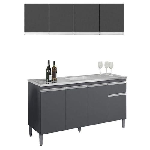 Balcão de Pia Tatiane 145 cm e Armário Aéreo Andréia 4 Portas 150 cm Cinza Fosco AJL