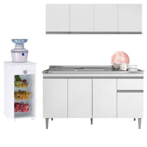 Balcão de Pia Tatiane 145 cm e Armário Aéreo Andréia 4 Portas 150 cm com Fruteira Monalise Branco Brilho AJL