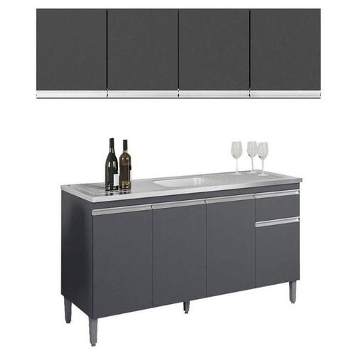 Balcão de Pia Tatiane 145 cm e Armário Aéreo Andréia 4 Portas 160 cm Cinza Fosco AJL