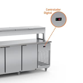 O balcão vem com um controlador digital de temperatura, que permite ajustes precisos e fácil visualização.