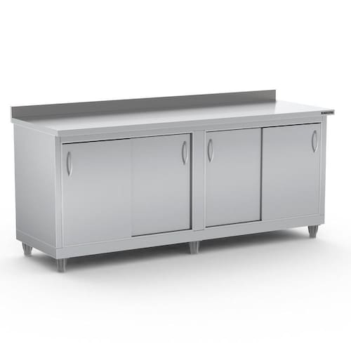Este balcão é construído com umaestrutura e gabinete em aço inox brilhoso, inclusive prateleira interna, garantindo durabilidade e resistência. Asportas de correr são feitas de aço inox. O tampo superior vem com um levante traseiro e uma borda quebra dágua, adicionando um toque de elegância ao design.