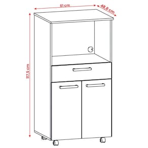 Composto de duas portas e uma ampla gaveta onde são utilizadas dobradiças e corrediças 100% metálicas, nicho para micro-ondas com passa fio que facilita o acesso a tomadas na parede e tampo para forno elétrico ou outro eletroportátil.