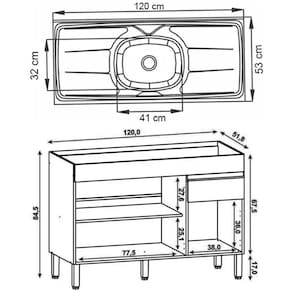 Balcão: 120 cm x 84,5 cm x 51,8 cm.