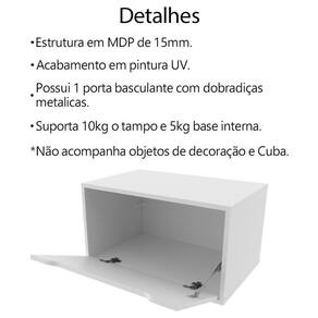 Balcão Gabinete 60 cm 1 Porta Basculante BN3646, ideal para inovar o seu banheiro com toque luxuoso e ao mesmo tempo refinado. Estrutura em MDP de 15mm, proporcionando maior durabilidade e resistência a peça, contando com acabamento em pintura UV. Composto por 1 porta basculante com frente usinada, possui articulador e dobradiças metálicas. Suportando 10kg o tampo e 5kg a base interna. Perfeito para deixar seu ambiente produtivo, proporcionando uma ambientação elegante e moderna. Este móvel chegará na sua casa separado em 1 volume.