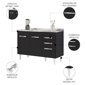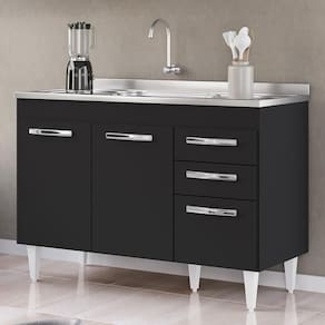 Na hora de escolher o móvel que vai compor o ambiente é preciso estar atento, afinal com cozinhas cada vez menores, deve ser compacto e funcional assim como o Balcão Gabinete com Pia Inox 120cm 3 Portas 2 Gavetas Suécia Preto, da Lumil.