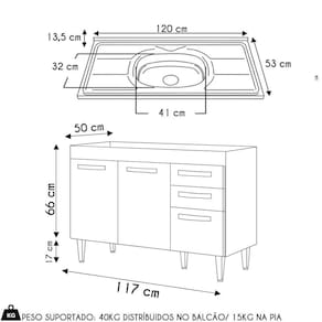 Pia Inox: 120 cm x 13 cm x 53 cm.