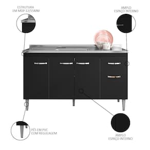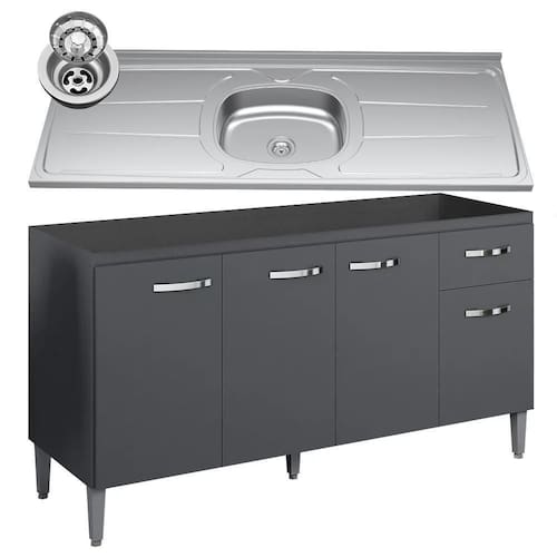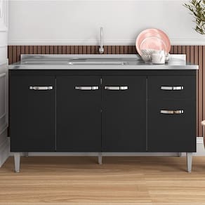 Conheça o Balcão Gabinete Com Pia Inox 150cm 4 Portas e 1 Gaveta Gabriela Preto, da AJL. Prático e funcional, para auxiliar no seu dia a dia!