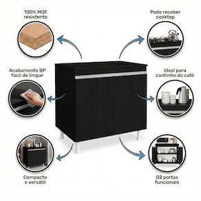 Com design versátil, pode ser utilizado como gabinete de cozinha, balcão para cooktop, cantinho do café, aparador compacto ou até mesmo em lavanderias, adaptando-se facilmente às diferentes necessidades do ambiente.