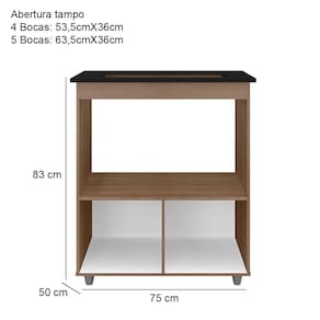 Características: Estrutura em MDP Acabamento em pintura UV 02 Portas com Dobradiças Metálicas Puxadores em Plástico Cromados Altura dos Pés 5 cm Pés fixo Amplo Espaço Interno para Organizar Utensílios Nicho para Forno ou Microondas Abertura do tampo: 4 Bocas 53,5cm X 36cm / 5 Bocas 63,5cm X 36cm