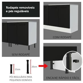 Os pés são reguláveis em PVC e o rodapé é removível em MDP, facilitando na hora de fazer a limpeza.