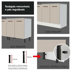 O móvel ainda acompanha tampo em MDP, que pode ser removido para a colocação de pia de inox ou pedra no tamanho de 150 cm de largura x 52 cm de profundidade.