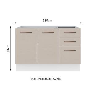 Os pés são reguláveis em PVC e o rodapé é removível para facilitar a limpeza. O espaço para a colocação de tampo ou pia é de 120 cm de largura por 52 cm de profundidade.