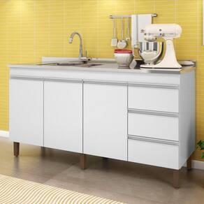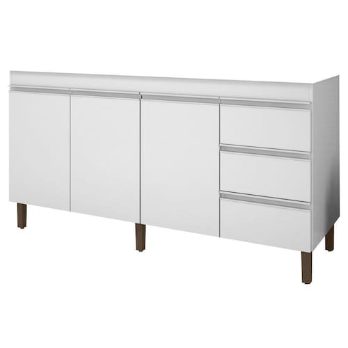 O Balcão com Tampo 159cm Karen 3 Portas, possui estrutura de ótima qualidade em MDP, com acabamento em pintura UV. Conta com dobradiças metálicas nas portas, gavetas com corrediças metálicas, pés com regulagem de altura, 01 prateleira interna para maior organização do ambiente, tampo de madeira e design moderno que torna sua cozinha muito mais bonita.