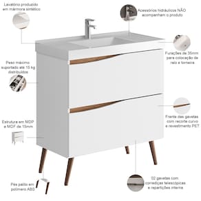 Esse balcão para banheiro, por seu design moderno, se adapta a vários estilos de decoração. Além disso, é fabricado com materiais de qualidade, o que confere alta durabilidade e resistência. O charme fica por conta dos pés palito e dos recortes nas gavetas, que adicionam um toque moderno e clean, já que substituem os puxadores. Ah, para adicionar ainda mais funcionalidade, as duas gavetas possuem diversas repartições internas, para facilitar a organização dos seus itens na correria do dia a dia. Por fim, o lavatório de mármore sintético deixa tudo mais completo. Aproveite os benefícios que esse móvel pode levar para sua casa!