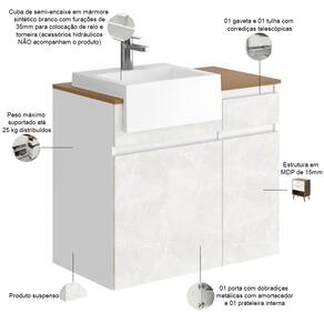 Esse balcão suspenso é fabricado com materiais de qualidade, o que confere ótima durabilidade, acabamento e resistência. Além disso, se você busca por um balcão de banheiro eficiente na organização dos itens, esse oferece excelente repartição interna, com uma prateleira interna, além de uma gaveta e uma tulha para roupas sujas. Em outras palavras, chega de bagunça no banheiro e de roupas espalhadas pelo chão. Não perca a chance de deixar seu cômodo ainda mais lindo e charmoso com o gabinete com cuba Moira!