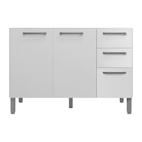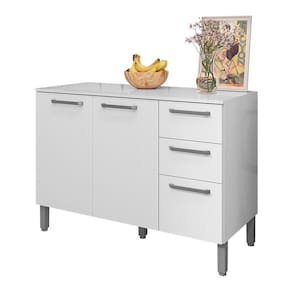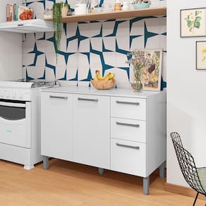 Seu design moderno e funcional se destaca pelo acabamento em branco, que traz um toque de sofisticação e luminosidade ao ambiente. As portas proporcionam um espaço interno espaçoso e bem distribuído, ideal para guardar panelas, pratos ou até mesmo alimentos. O gavetão é amplo, perfeito para armazenar talheres, toalhas de mesa ou outros itens maiores.