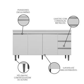 **ACOMPANHA TAMPO. Características do Produto Material da Estrutura: MDP 15 mm. Material do Fundo: MDF 3 mm. Peso Suportado: 48 Kg distribuídos. Acompanha Pia: Não. Acompanha Tampo: Sim. Acabamento: Pintura UV. Escala de Brilho: Fosco. Quantidade de Portas: 3 Portas. Material da Porta: MDP. Tipo de Porta: Convencional. Quantidade de Gavetas: 3 Gavetas. Material da Gaveta: MDP. Tipo de Puxador: Alumínio. Tipo de Corrediças: Metálicas. Possui Prateleiras: Sim. Quantidade de Prateleiras: 1 Prateleira. Material da Prateleira: MDP. Possui Pés: Sim. Quantidade de Pés: 5 Pés. Tipo de Pés: PVC com regulagem. Diferenciais: - Design moderno. - Pés ajustáveis. Sistema de Montagem: Cavilhas/Parafusos. Manual de Montagem: Sim. Complexidade da Montagem: Média. Volumes: 2 Volumes. Conteúdo da Embalagem: 1 Balcão, 1 Tampo. Garantia do Fabricante: 90 dias contra defeito de fabricação. Montagem: Recomendamos que seja feita por um profissional. Recomendação de Limpeza: Utilize pano úmido.