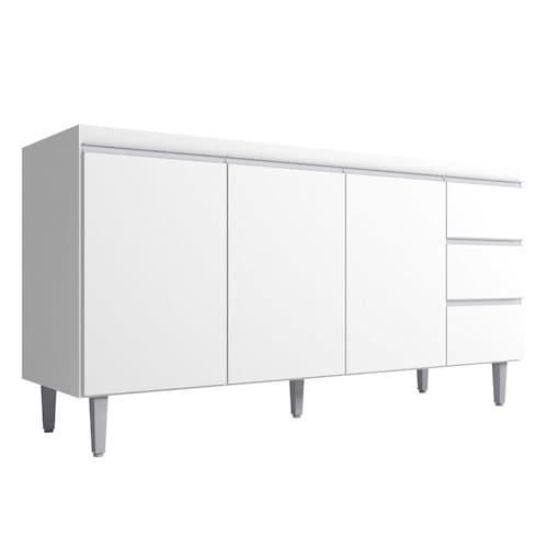 **ACOMPANHA TAMPO. Características do Produto Material da Estrutura: MDP 15 mm. Material do Fundo: MDF 3 mm. Peso Suportado: 48 Kg distribuídos. Acompanha Pia: Não. Acompanha Tampo: Sim. Acabamento: Pintura UV. Escala de Brilho: Fosco. Quantidade de Portas: 3 Portas. Material da Porta: MDP. Tipo de Porta: Convencional. Quantidade de Gavetas: 3 Gavetas. Material da Gaveta: MDP. Tipo de Puxador: Alumínio. Tipo de Corrediças: Metálicas. Possui Prateleiras: Sim. Quantidade de Prateleiras: 1 Prateleira. Material da Prateleira: MDP. Possui Pés: Sim. Quantidade de Pés: 5 Pés. Tipo de Pés: PVC com regulagem. Diferenciais: - Design moderno. - Pés ajustáveis. Sistema de Montagem: Cavilhas/Parafusos. Manual de Montagem: Sim. Complexidade da Montagem: Média. Volumes: 2 Volumes. Conteúdo da Embalagem: 1 Balcão, 1 Tampo. Garantia do Fabricante: 90 dias contra defeito de fabricação. Montagem: Recomendamos que seja feita por um profissional. Recomendação de Limpeza: Utilize pano úmido.