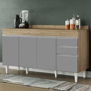 Quanto ao acabamento e estrutura também não há o que questionar, porque é fabricado em MDP 15mm com acabamento BP e os puxadores em alumínio modelo cava dão um toque de modernidade. Para completar, o Tampo em MDP 15mm agrega ainda mais utilidade, uma vez que você pode fazer uso de itens decorativos ou até criar aquele cantinho do café, deixando o ambiente muito mais bonito, até porque o coração da casa merece esse cuidado.
