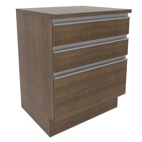 Possui 3 gavetas grandes, sendo a última mais profunda, com puxadores em alumínio e corrediças telescópicas que possibilitam a abertura total das gavetas. Possui pés em PVC com regulagem de altura e rodapé removível em MDP de fácil encaixe.