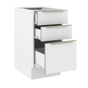 O balcão possui três gavetas grandes, sendo a última mais profunda, todas com puxadores em alumínio e corrediças telescópicas que possibilitam a abertura total.