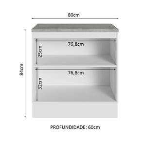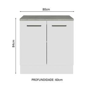 O móvel acompanha ainda tampo resistente em MDP e os pés são reguláveis em PVC, com rodapé removível para facilitar a limpeza.