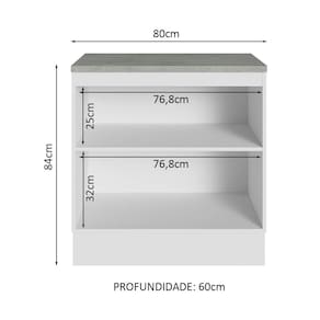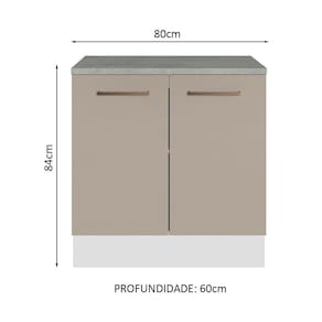 O móvel acompanha ainda tampo resistente em MDP e os pés são reguláveis em PVC, com rodapé removível para facilitar a limpeza.