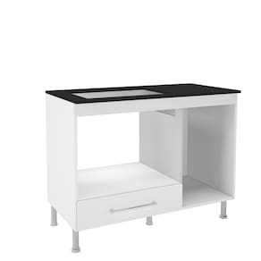 Ele é produzido em chapas de MDP de 15mm, material resistente e diferenciado pela sua pintura em uv-ultravioleta em padrões amadeirados. Possui corrediças telescopia metálicas de 400mm, dobradiças metálicas e pés em PVC. O balcão segue com recorte padrão, podendo ser aumentado por um profissional.