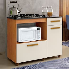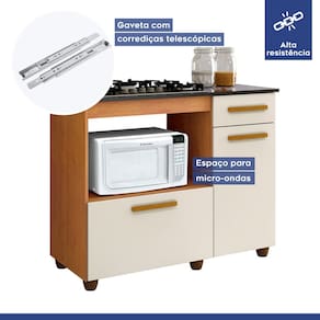 Versatilidade: Possui portas do tipo bater e basculante, além de gaveta funcional para talheres.