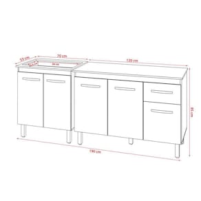 Altura com os pés: 83,5 cm Altura sem os pés: 67 cm Largura: 118 cm Profundidade: 50 cm Material: MDP (madeira) Portas: 3 portas Gavetas: 1 gaveta Prateleiras: 1 prateleira Puxadores: 4 puxadores plásticos cromados Pés: 5 pés reguláveis de plástico Altura dos pés: 16,5 cm Regulagem dos pés: Somente para nivelamento, até 18 cm Corrediças: Metálicas Indicações de Uso: Cozinha